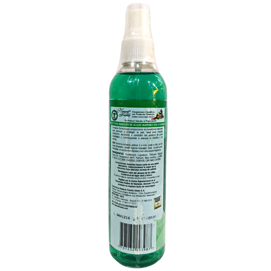Aceite de Algas Marinas - Natural Freshly - Frasco 240 ml Exclusiva fórmula que proporciona los beneficios naturales para suavizar y proteger la piel. Ideal para masajes reductores ayudando a combatir los exceso de grasa localizada y contribuyendo a atenuar la celulitis y las estrías.