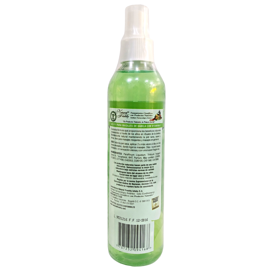 Aceite de Sábila - Natural Freshly - Frasco 240 ml Exclusiva formulación que proporciona los beneficios naturales a través de los años en rituales de belleza. Biohidratante natural manteniendo la piel sana, suave y tersa. Ideal para masajes relajantes y masajes en general.