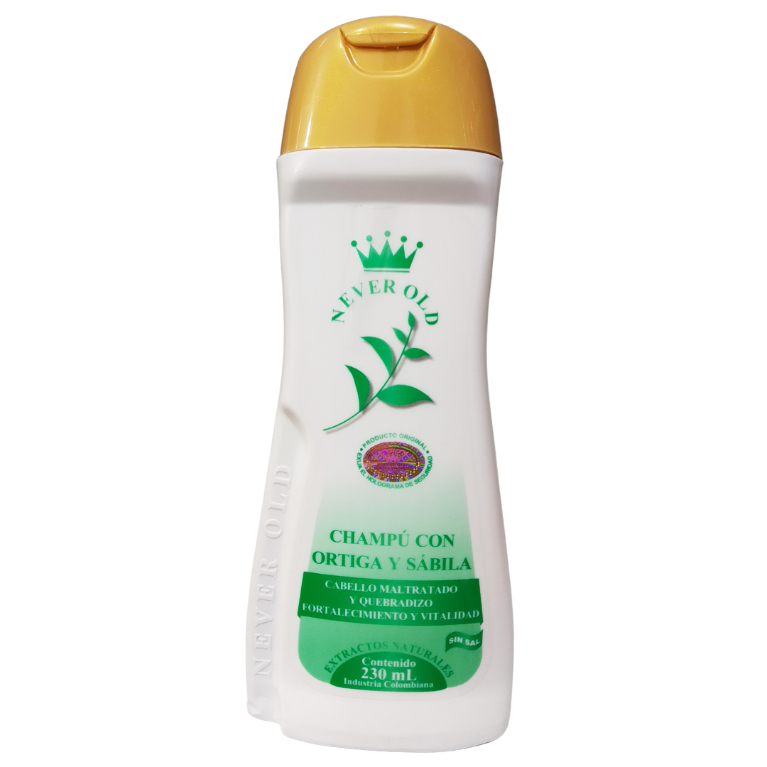 Champú Con Ortiga y Sábila - Never Old - Frasco 230 ml Formula natural que combina Ortiga y Sábila, que penetra en el cuero cabelludo fortaleciendo desde la raíz. La Sábila limpia, hidrata, regenera, nutre y protege el cabello para que luzca un aspecto saludable. La Ortiga contiene vitaminas B1, B12, B5, C, D y E. Es muy rica en hierro, calcio, silice, azufre, potasio, y manganeso, razón por la que se usa para la salud general del cabello, indicada para cabellos débiles, con tendencia a la caída, o grasos, regulando el exceso de sebo y ayudando a combatir la caspa.