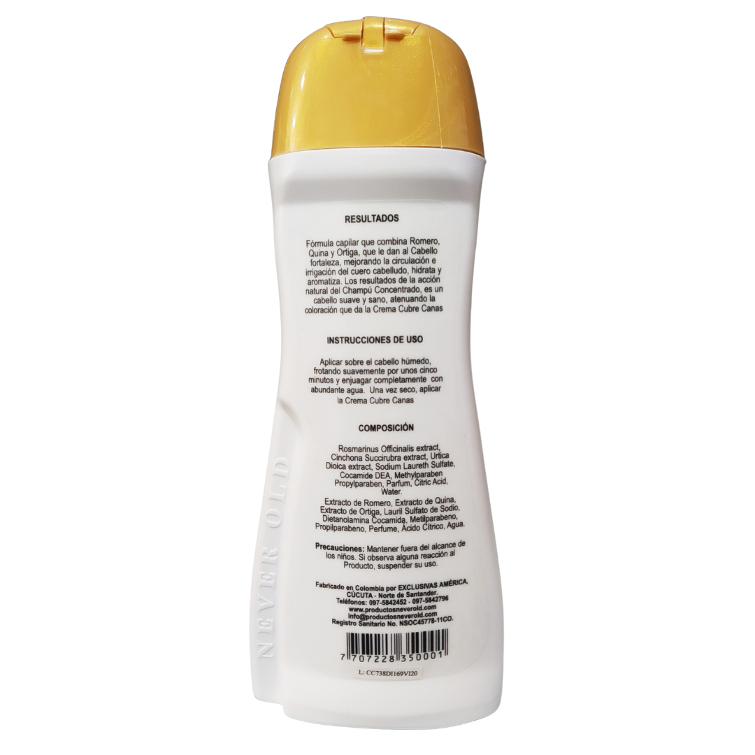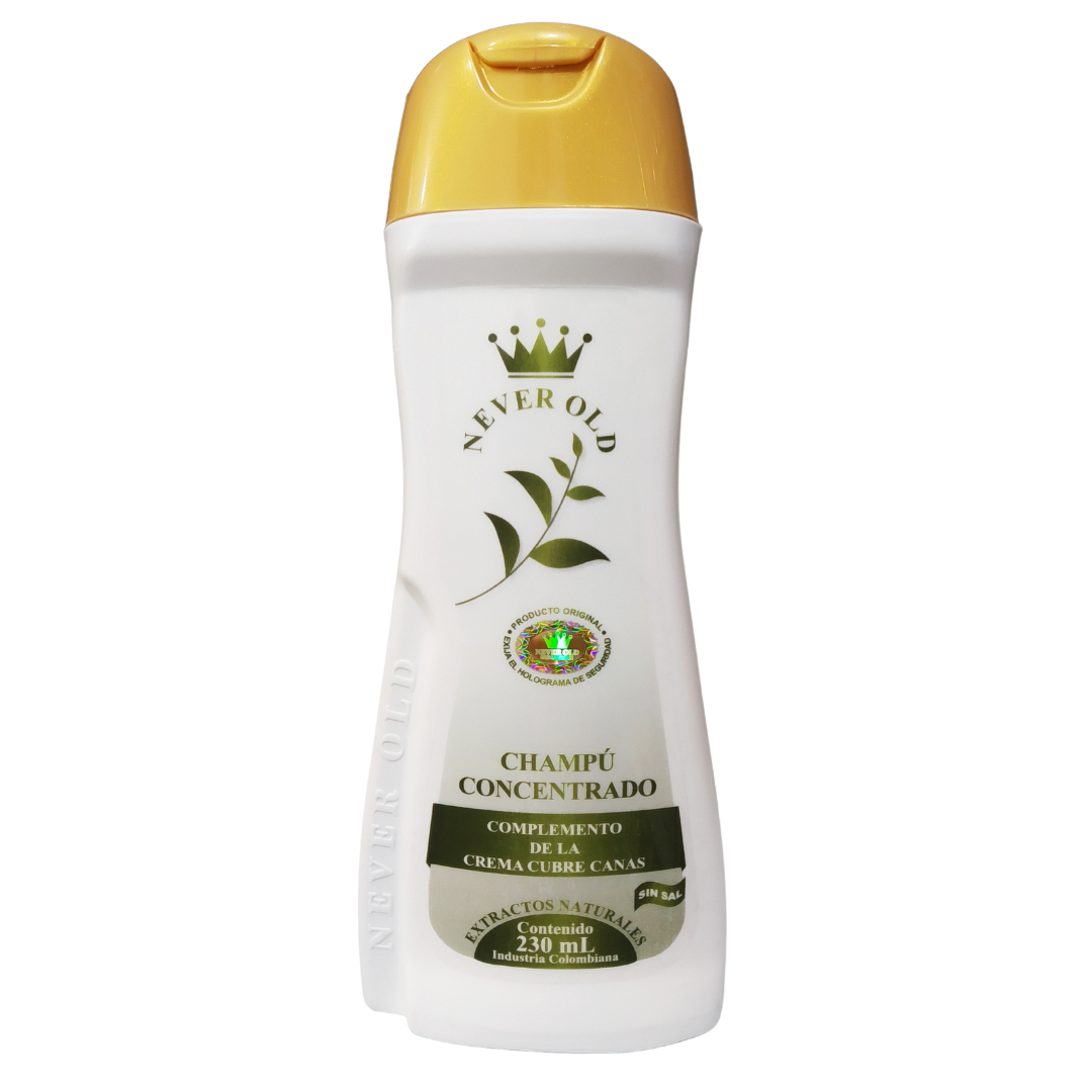Champú Concentrado - Never Old - Frasco 230 ml Formula capilar que combina Romero, Quina y Ortiga, que le dan al cabello fortaleza, mejorando la circulación e irrigación del cuero cabelludo, hidrata y aromatiza. Los resultados de la acción natural del Champú Concentrado, es un cabello suave y sano atenuando la colaboración que da la Crema Cubre Canas.