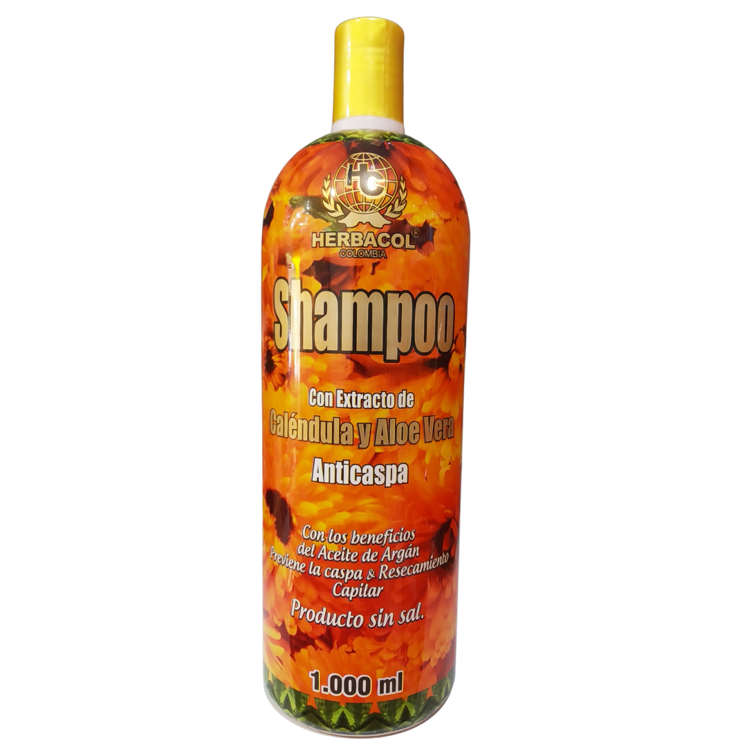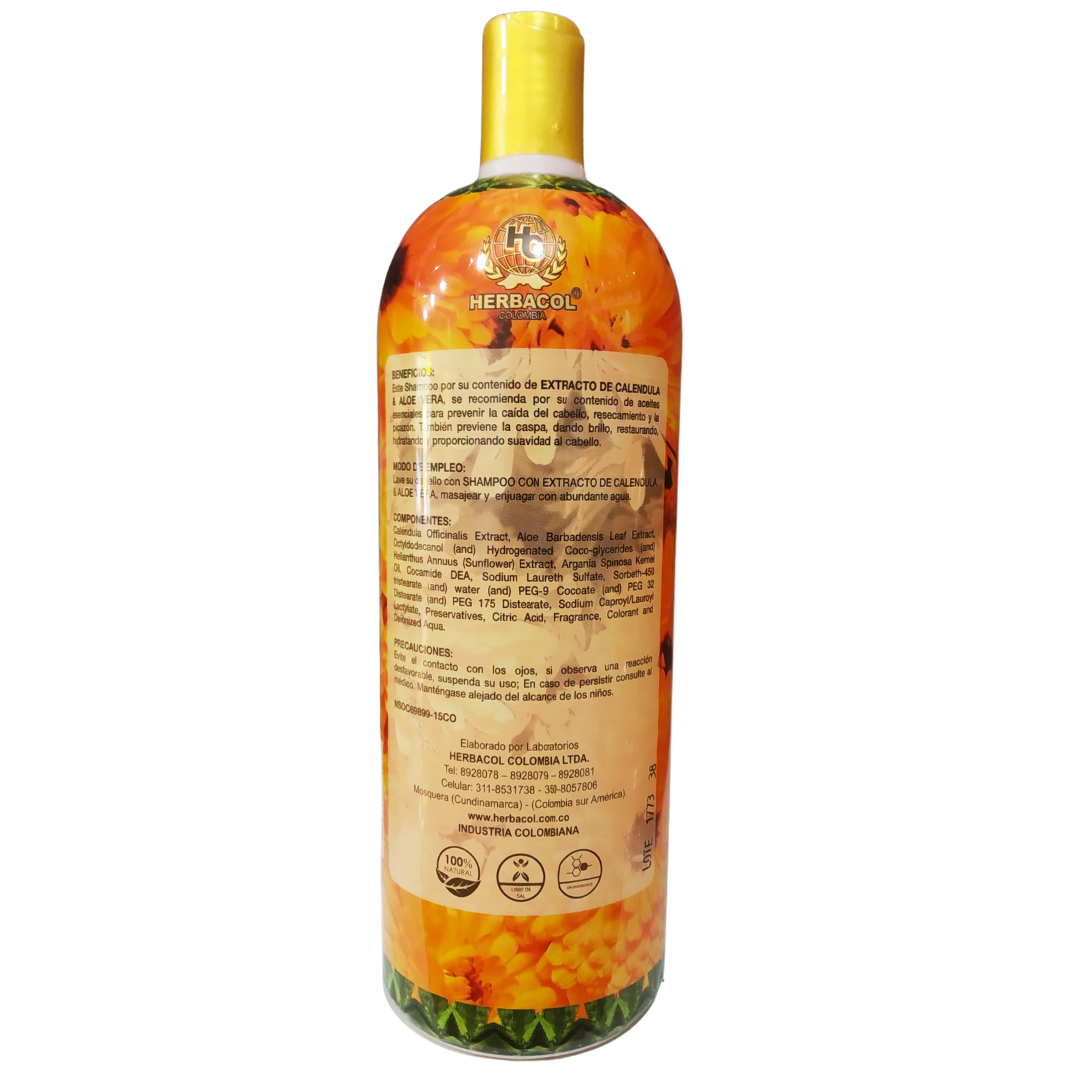 Shampoo Con Extracto de Caléndula y Aloe Vera - Herbacol - Frasco 240 / 1000 ml Este Shampoo por su contenido de Extracto de Caléndula y Aloe Vera, se recomienda por su contenido de aceites esenciales para prevenir la caída del cabello, resecamiento y la picazón. También previene la caspa, dando brillo, restaurando, hidratando y proporcionando suavidad al cabello. Libre de sal, sin parabenos.