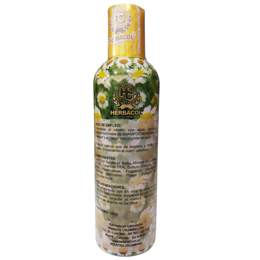 Shampoo Con Fragancia de Manzanilla - Herbacol - Frasco 240 ml El Shampoo Con Fragancia de Manzanilla es un producto natural que da limpieza y brillo a su cabello, fortaleciendo el cuero cabelludo.