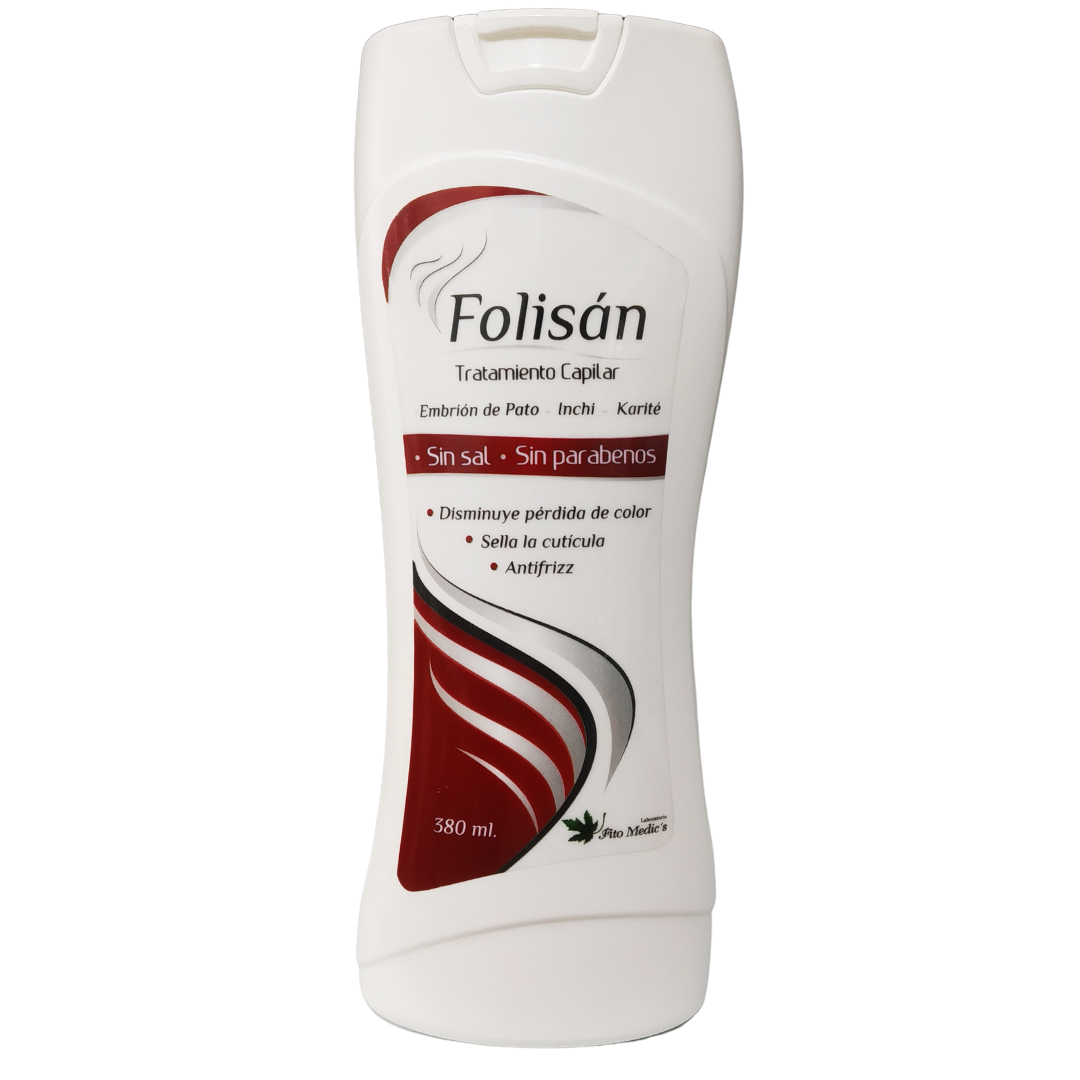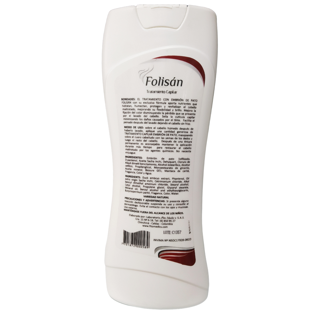Tratamiento Capilar Folisán - Fito Medic's - Frasco 380 ml El Tratamiento con Embrión de Pato Folisán con su exclusiva fórmula aporta nutrientes que hidratan, humectan, protegen y revitalizan el cabello maltratado, mejorando su flexibilidad y brillo. Mejora la fijación del color disminuyendo la pérdida que se presenta por el lavado del cabello. Sella la cutícula capilar minimizando los daños causados por el tinte. Facilita el peinado después del lavado dejando el cabello sin friz.