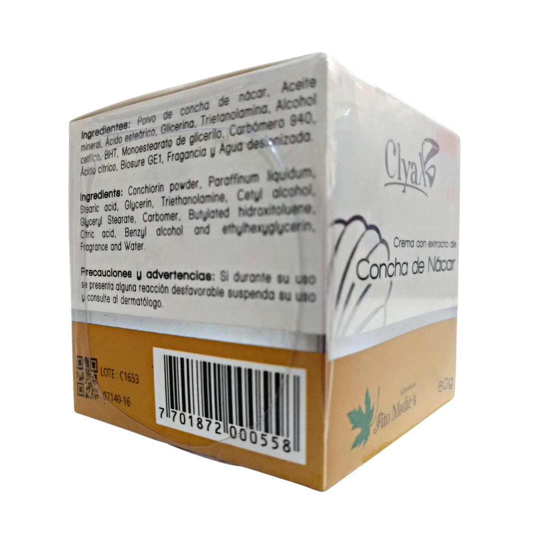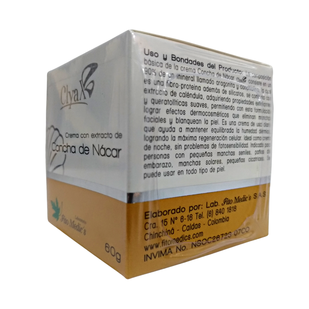 Crema Concha de Nácar - Fito Medic's - Frasco 60 gr La composición básica de la crema concha de nácar consiste en un 90% de un mineral llamado aragonita y conchiolina, la cual es una fibro-proteína además de silicatos, se combina con extracto de caléndula, adquiriendo propiedades exfoliantes y queratolíticas suaves, permitiendo con esta formulación lograr efectos dermocosméticos que eliminan manchas faciales y blanquean la piel.