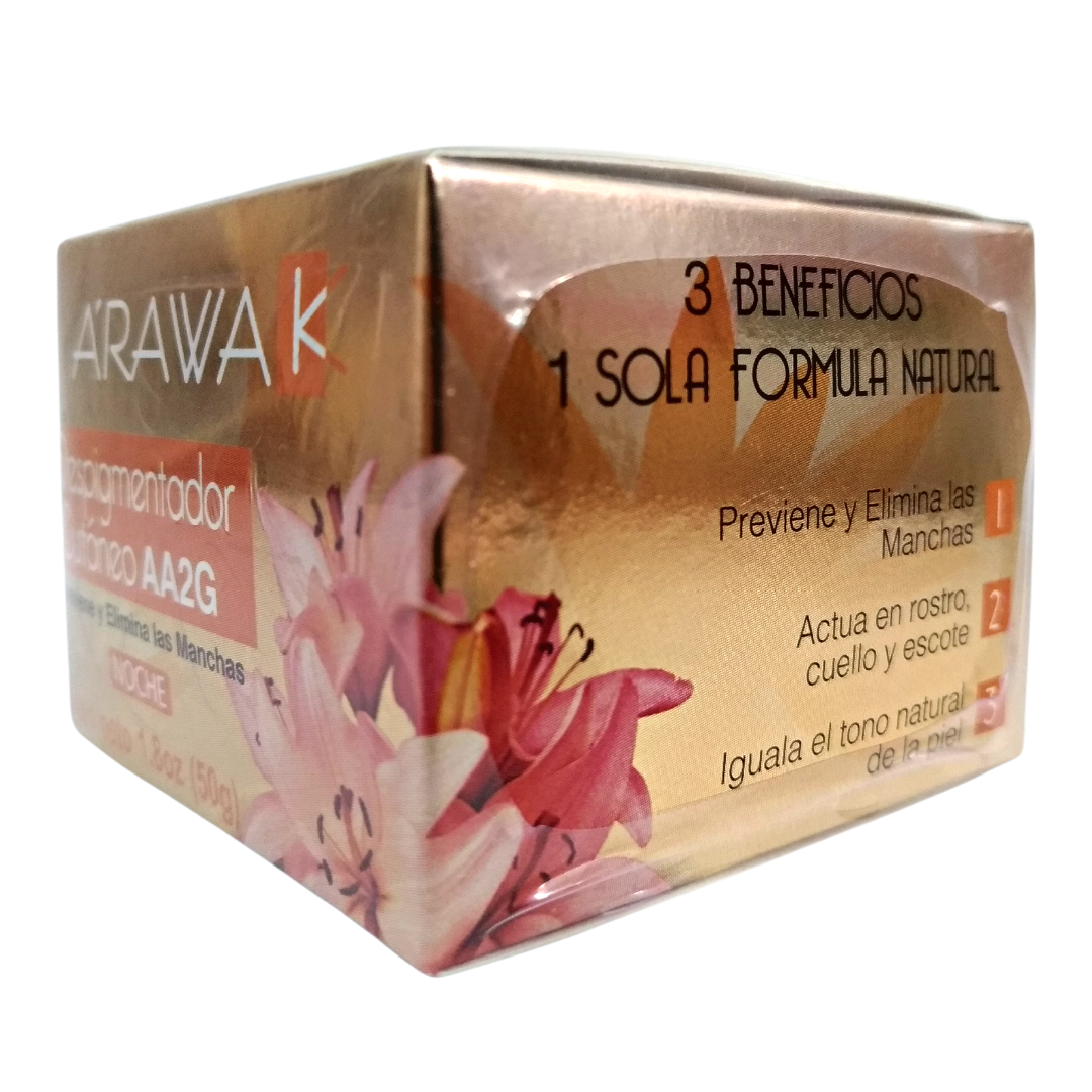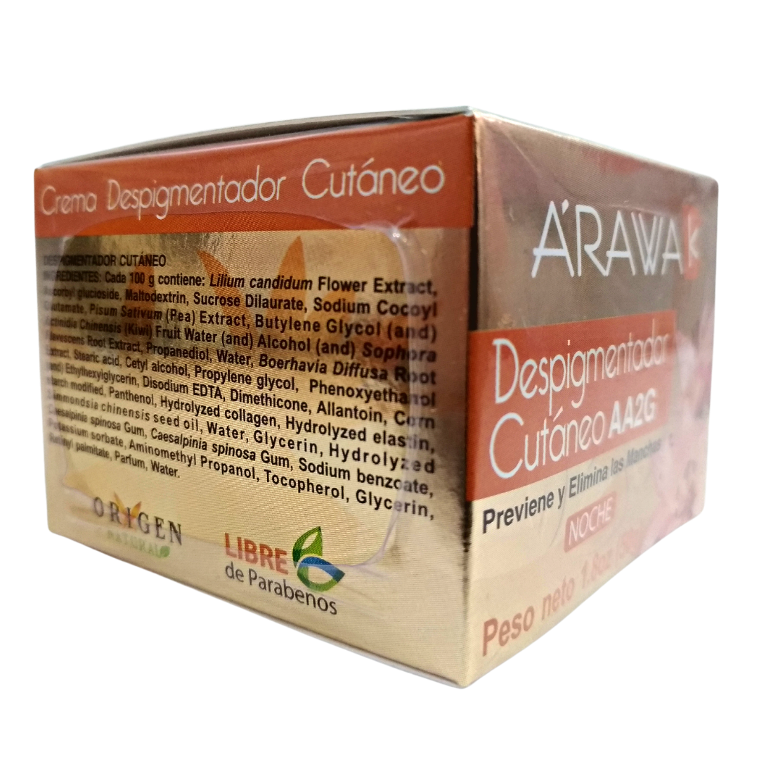 Despigmentador Cutáneo AA2G - Arawak - Frasco 50 gr El Despigmentador Cutáneo AA2G, actúa sobre la piel disminuyendo y controlando la aparición de manchas oscuras causadas por hiperpigmentación. Sus componentes desmanchan la piel al mismo tiempo que le proporcionan una suave textura.
