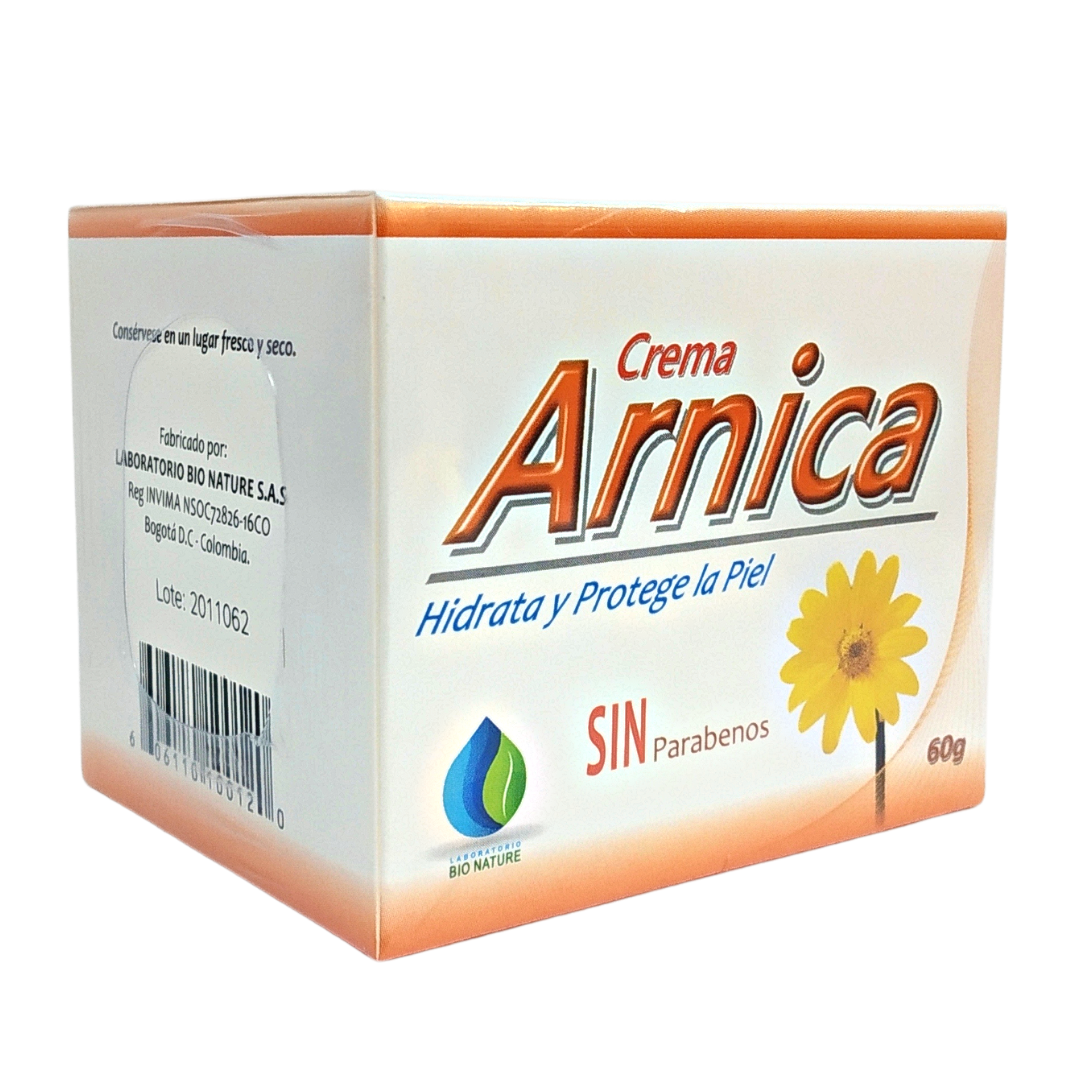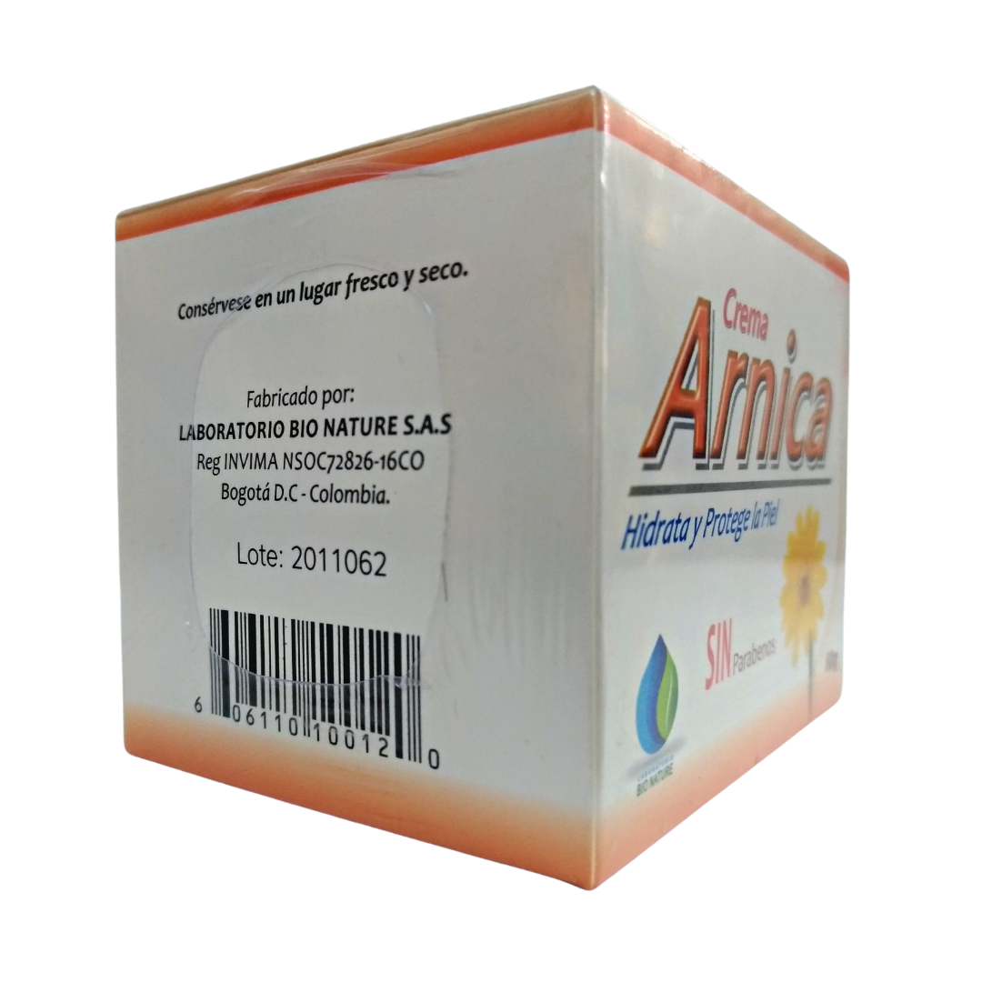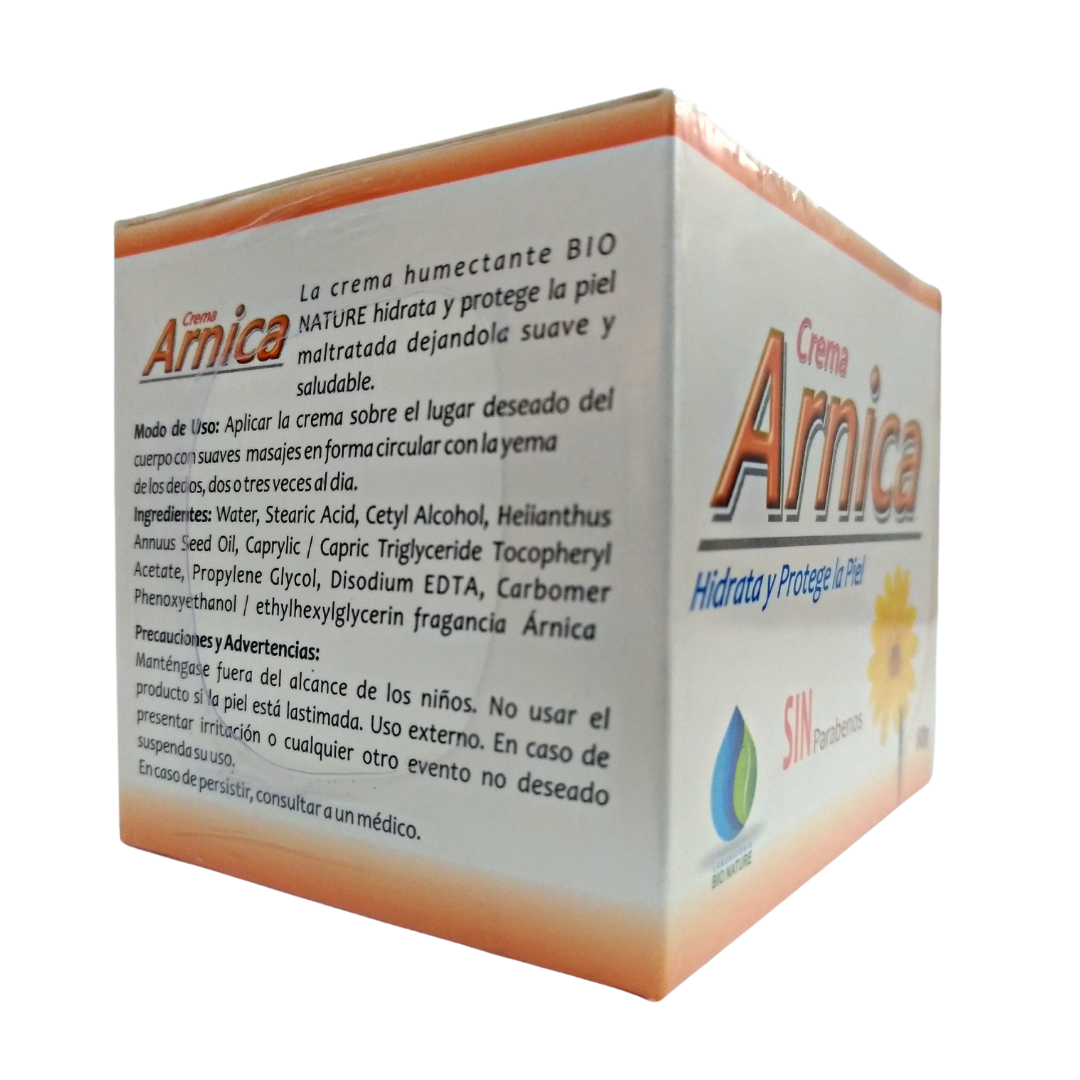 Crema de Árnica - Bio Nature - Frasco 60 gr La Crema de Árnica se usa generalmente para aliviar dolores musculares e inflamaciones y curar heridas. Cuando se aplica sobre la piel, puede mejorar la sanación al reducir la hinchazón y el dolor y acelerar la reabsorción de la sangre.