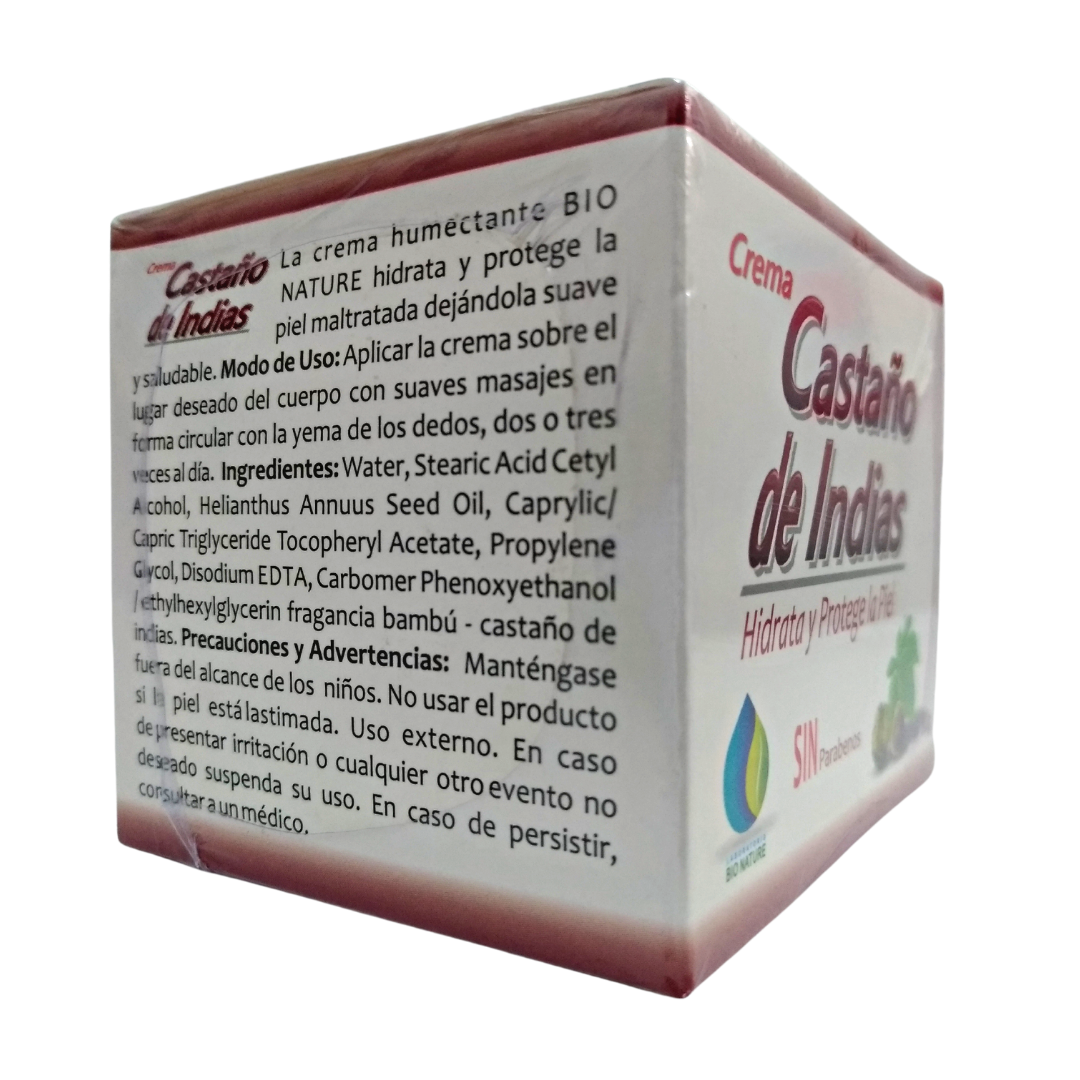Crema de Castaño de Indias - Bio Nature - Frasco 60 gr La Crema de Castaño Indias previene y cura enfermedades del sistema circulatorio, especialmente en lo que se refiere a las venas. Sirve para tratar edemas o inflamaciones en el cuerpo y se resaltan las venas o cuando aparecen moretones. Es útil también para tratar las hemorroides.