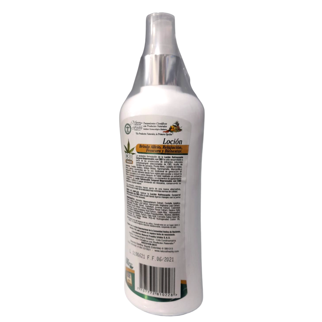 Loción Biopronnabis CBD CANNABIS - Natural Freshly - Frasco 240 ml La exclusiva formulación de la Loción Refrescante Corporal Biopronnabis con CBD ha sido desarrollada a partir de las propiedades de extractos naturales cuidadosamente seleccionados de CBD, aceite de semillas de cannabis, pronto alivio, castaño de indias, calendula, centella asiatica, ginkgo biloba, ammamelis, manzanilla y arnica, plantas reducidas por su uso tradicional de generacion en generacion. Han sido utilizados desde hace siglos para ayudar a reducir la tension acumulada en el cuerpo despues de haber realizado un esfuerzo fisico o molestias ocasionadas por golpes y en momentos de agotamiento y cansancio.