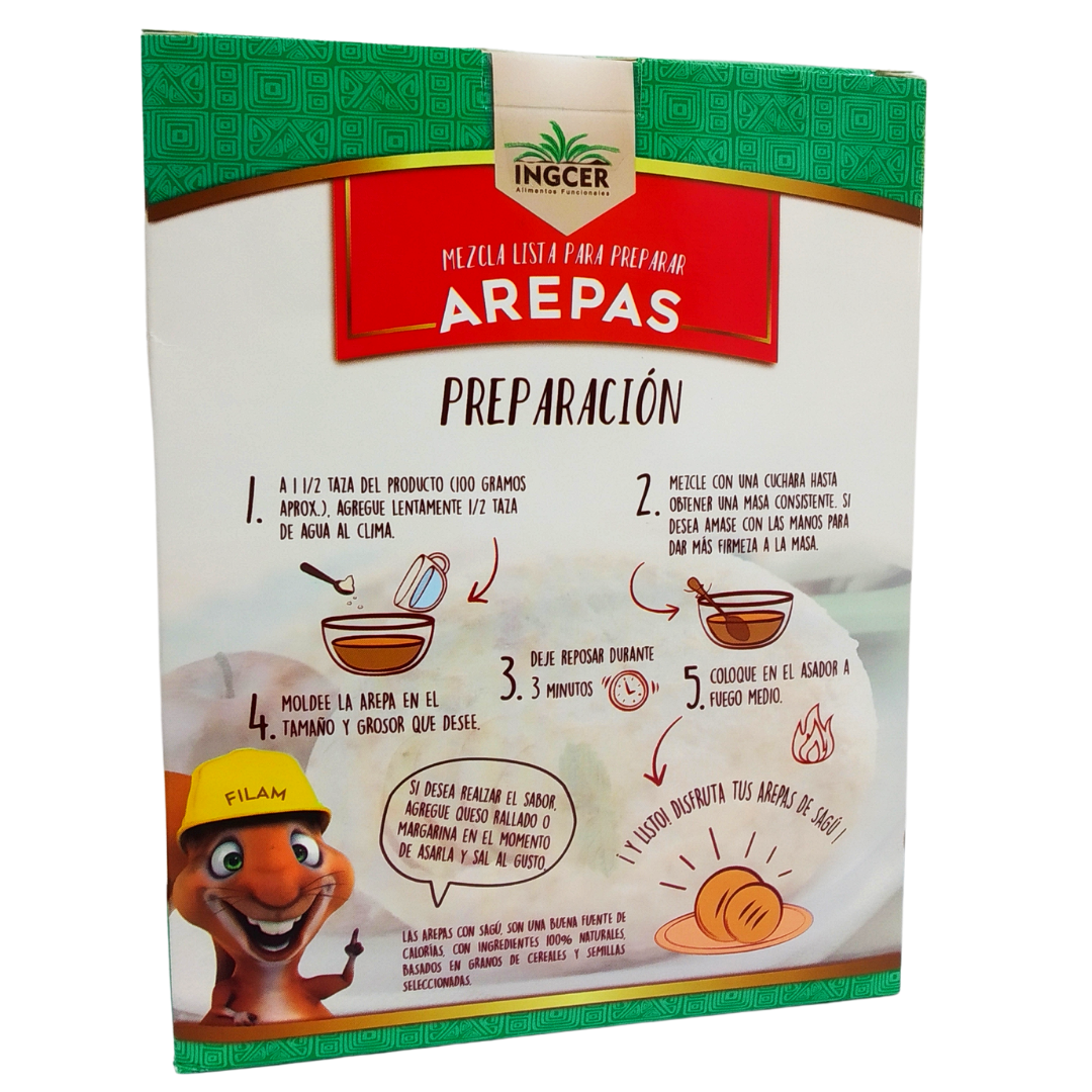 Mezcla Lista Para Preparar Arepas Con Harina de Sagú - INGCER - Caja 500 gr Mezcla lista para arepas con harina de sagú, arroz integral y quinua expandida, Producto libre de GLUTEN, Apto para veganos, vegetarianos y dietas saludables.