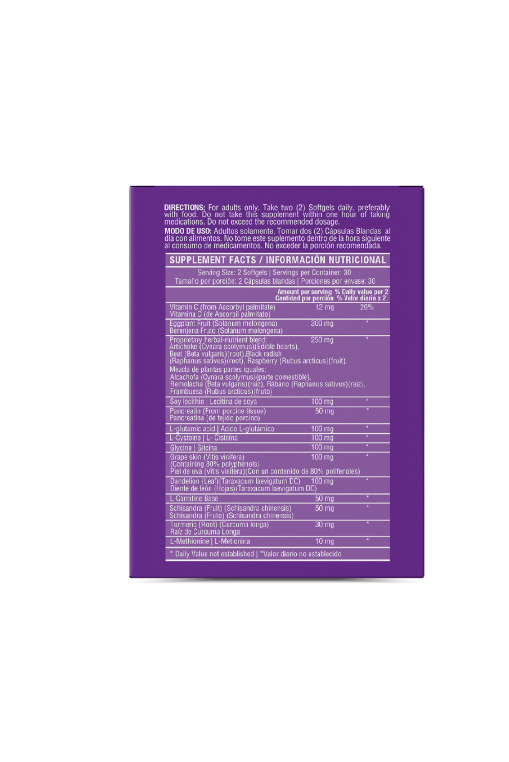 Componentes Alcachofa parte comestible de (cynara scolymus), raíz de remolacha (beta vulgaris), raíz de rábano (raphanus sativus), fruto de frambuesa (rubus arcticus) (vegetal), Fruto de berenjena (solanum melongena) (vegetal), Pancreatina de tejido porcino (enzima), Ácido L-Glutámico (aminoácido), L-Cisteína (aminoácido), Glicina (aminoácido), Piel de uva (vitis vinífera, con un contenido de 80% polifenoles) (vegetal), Diente de león (taraxacum laevigatum) hojas (vegetal), L-carnitina base (aminoácido), Schisandra chinensis fruto (vegetal), Raíz de Curcuma Longa (vegetal), L-metionina (aminoácido).
