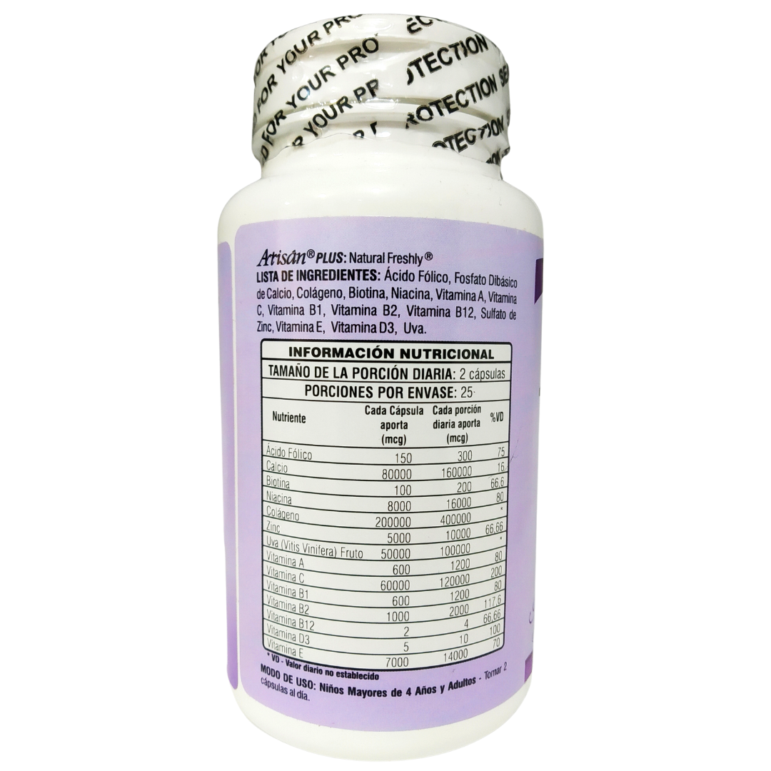 Componentes Ácido Fólico, Fosfato Dibásico de Calcio, Colágeno, Biotina, Niacina, Vitamina A, Vitamina C, Vitamina B1, Vitamina B2, Vitamina B12, Sulfato de Zinc, Vitamina E, Vitamina D3, Uva.