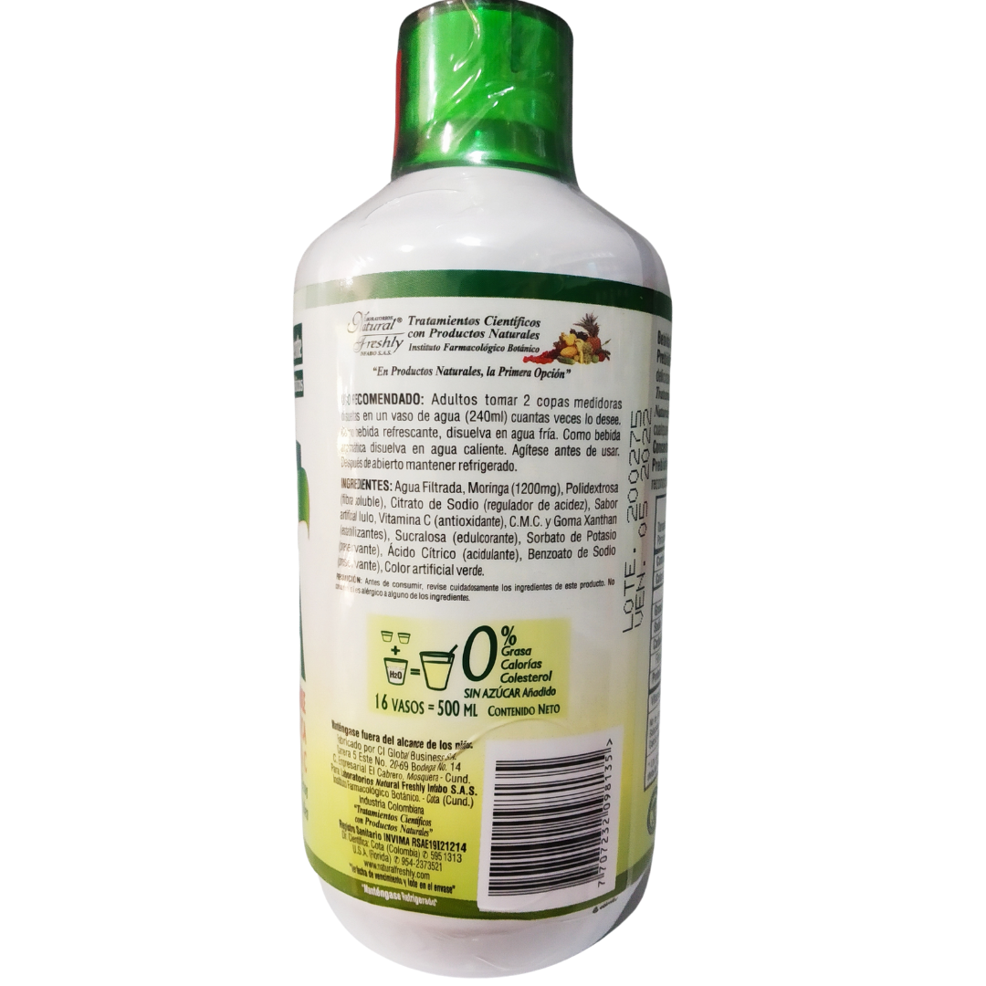 Componentes Agua purificada, Moringa, polidextrosa, citrato de sodio, sabor artificial a lulo, Vitamina C, C.M.C. Y Goma Xanthan, sucralosa, Sorbato de potasio, Ácido cítrico, benzoato de sodio, colorante artificial verde.