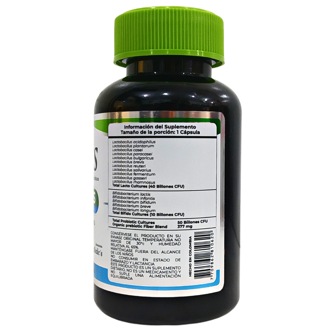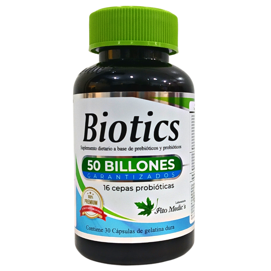 Biotics - Fito Medic´s - Frasco x 30 Cápsulas Los probióticos son alimentos o suplementos que contienen microorganismos vivos destinados a mantener o mejorar las bacterias "buenas" (microbiota normal) del cuerpo. Los prebióticos son alimentos (generalmente con alto contenido de fibra) que actúan como nutrientes para la microbiota humana.