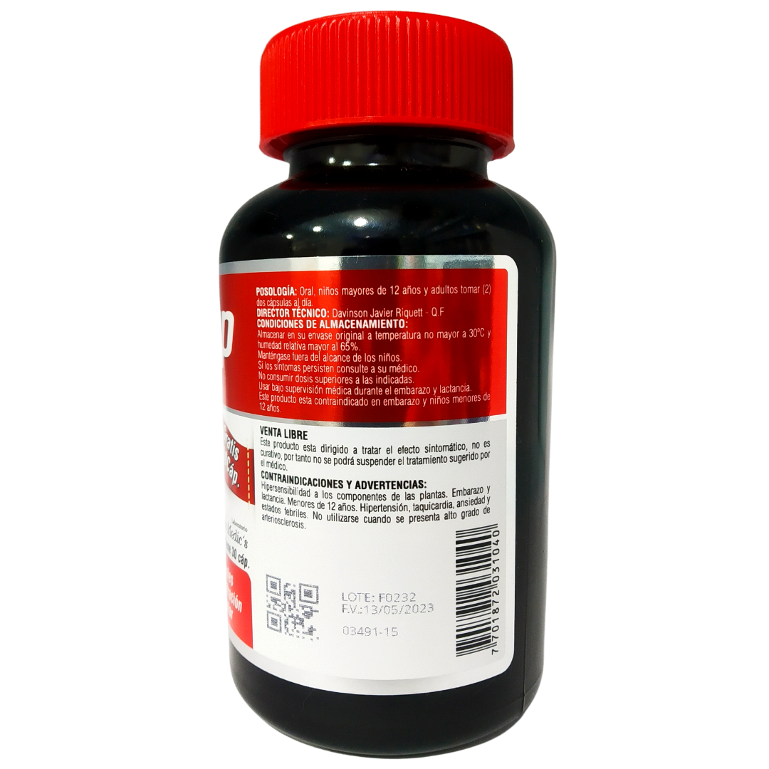 Precauciones Almacenar en su envase original a temperatura no mayor a 30°C y humedad relativa mayor al 65%. Manténgase fuera del alcance de los niños. Si los síntomas persisten consulte a su médico. No consumir dosis superiores a las indicadas. Usar bajo supervisión medica durante el embarazo y lactancia. Este producto esta contraindicado en embarazo y niños menores de 12 años.