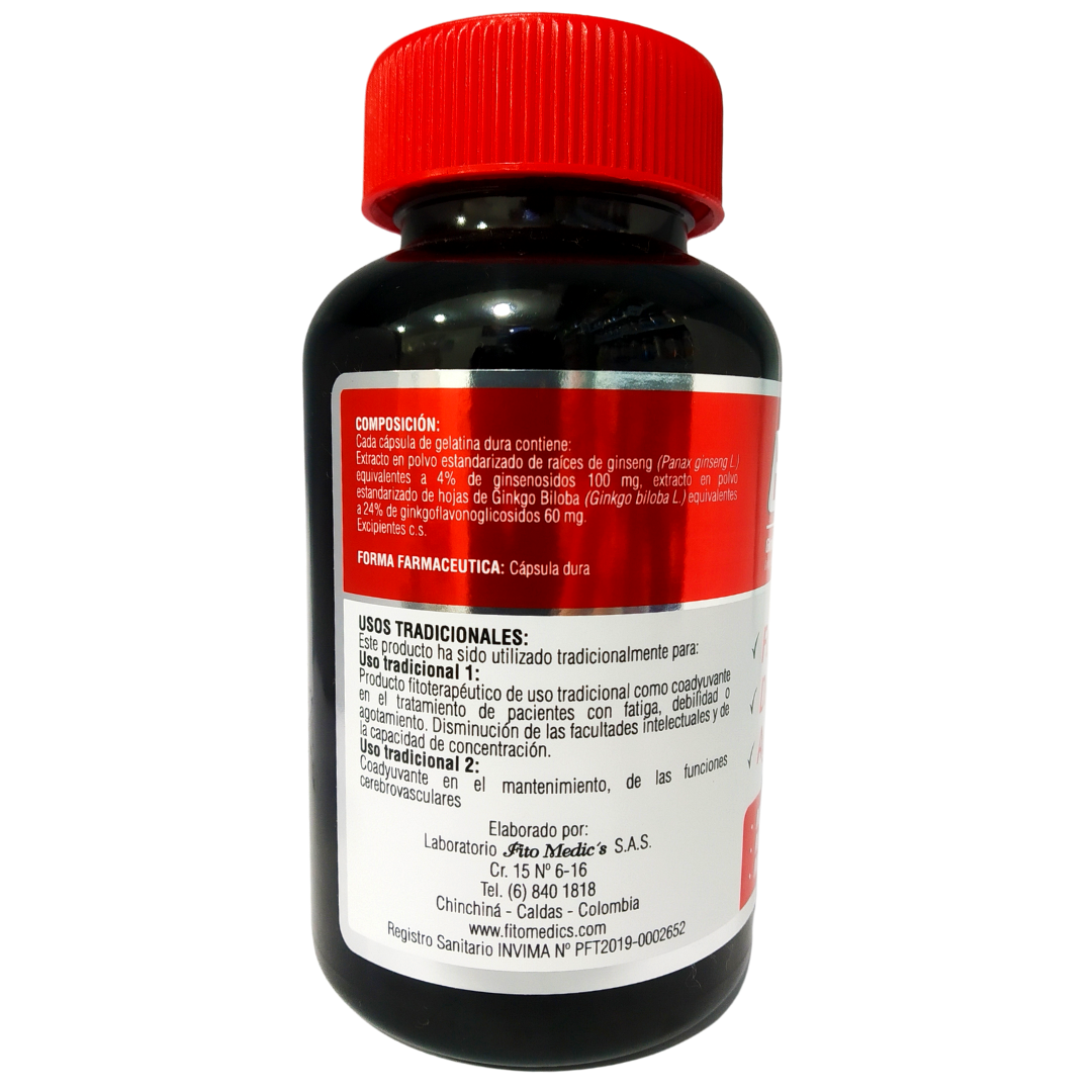 Componentes Cada cápsula de gelatina dura contiene: Extracto en polvo estandarizado de raíces de Ginseng equivalente a 4% de ginsenosidos 100 mg, extracto en polvo estandarizado de hojas de Ginkgo Biloba equivalentes a 24% de ginkgoflavonoglicosidos 60 mg. Excipientes c.s.