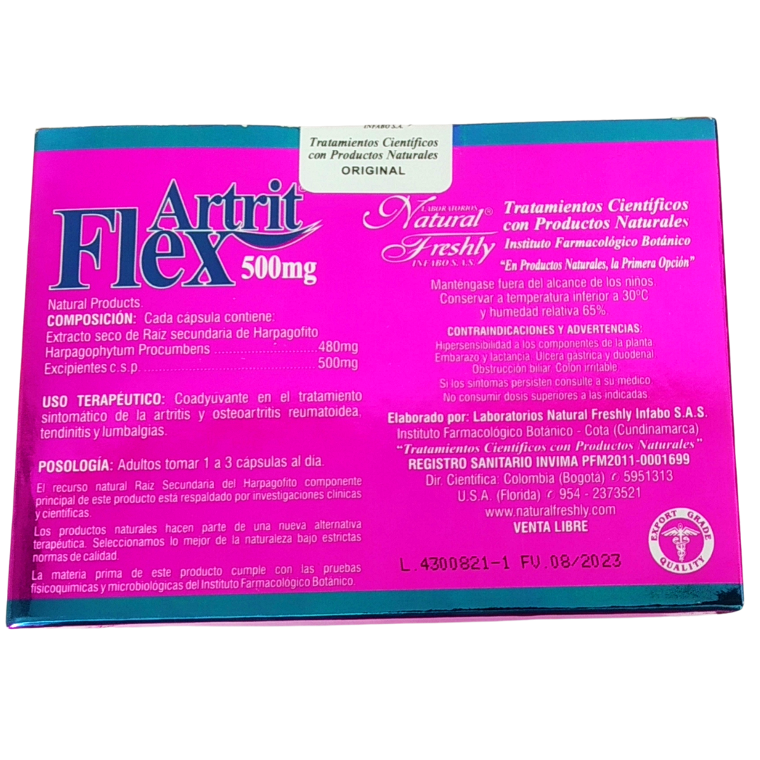 Componentes Cada capsula contiene: Extracto seco de Raíz secundaria de Harpagofito 480 mg, Excipientes c. s.p. 500 mg