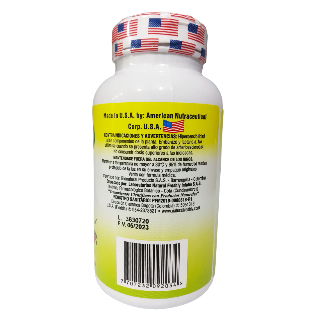 Contraindicaciones y Advertencias Hipersensibilidad a los componentes de la planta. Embarazo y lactancia. No utilizarse cuando se presenta alto grado de arterioesclerosis. No consumir dosis superiores a las indicadas. Manténgase fuera del alcance de los niños. Mantener a temperatura no mayor a 30 °C y 65% de humedad relativa, protegido de la luz en su envase y empaque originales.