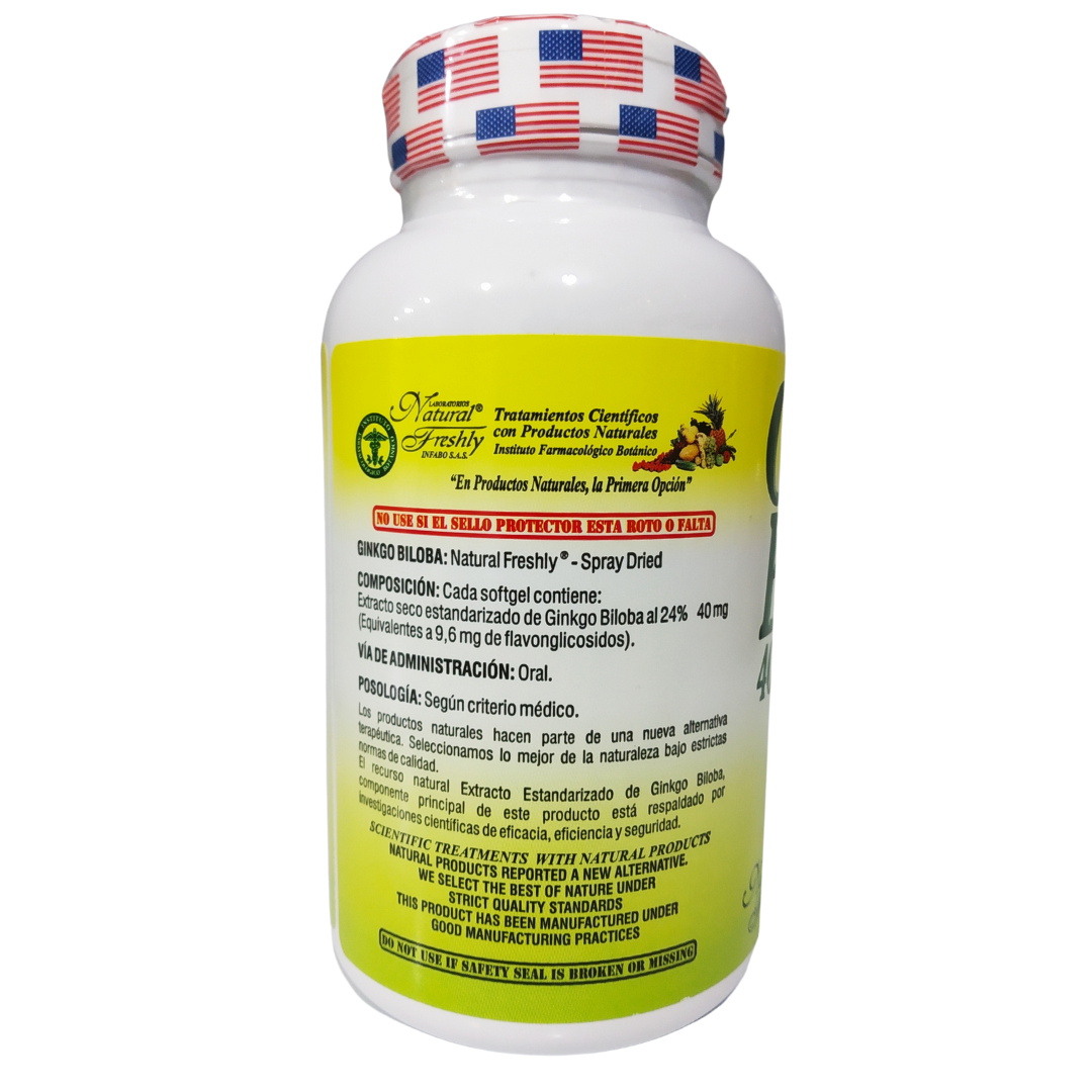 Ginkgo Biloba 40 mg - Natural Freshly - Frasco x 80 Cápsulas Las hojas de Ginkgo Biloba ayudan a mejorar la circulación de la sangre incrementa la oxigenación del corazón, del cerebro y en general en todas las partes del cuerpo.