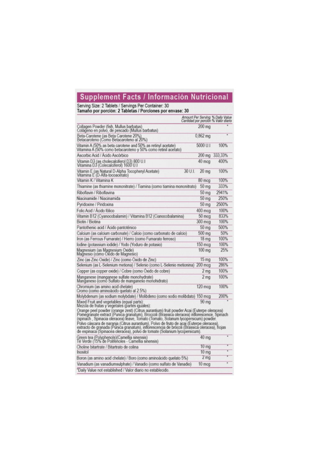 Componentes Betacaroteno, Vitamina A, Ácido Ascórbico, Vitamina D3 (Colecalciferol), Vitamina E, Vitamina K, Tiamina, Riboflavina, Niacinamida, Piridoxina, Ácido Fólico, Vitamina B12 (Cianocobalamina), Biotina, Ácido Pantoténico, Calcio, Hierro, Yodo, Magnesio, Zinc, Selenio, Cobre, Manganeso, Cromo, Molibdeno, Colágeno en Polvo de Pescado (Mullus Barbatus) (proteína de origen marino). Mezcla De Frutas y Vegetales Partes Iguales (Polvo De Cáscara de Naranja – Citrus Aurantium, Polvo Fruto Açaí – Euterpe Oleracea, Extracto de Granada - Punica Granatum, Inflorescencia Brócoli - Brassica Oleracea, Hojas de Espinaca - Spinacea Oleracea, Polvo de Tomate - Solanum Lycopersicum), Té Verde (Camelia Sinensis), Bitartrato de Colina, Inositol, Boro, Vanadio (vegetal).