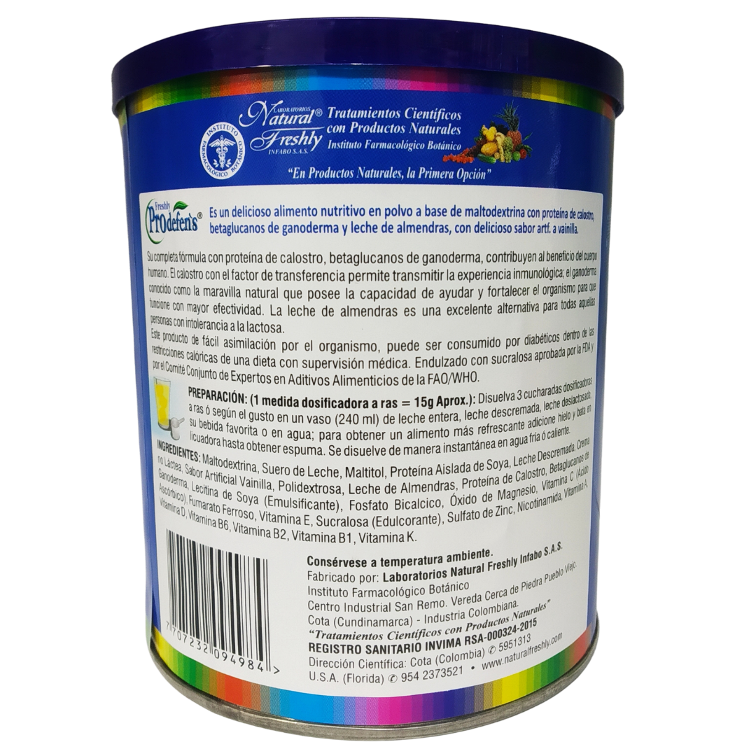 Prodefens - Natural Freshly - Tarro 400 gr Su completa fórmula con proteína de calostro, betaglutanos de ganoderma, contribuyen al beneficio del cuerpo humano. El calostro con el factor de transferencia permite transmitir la experiencia inmunológica; el ganoderma conocido como la maravilla natural que posee la capacidad de ayudar y fortalecer el organismo para que funcione con mayor efectividad.