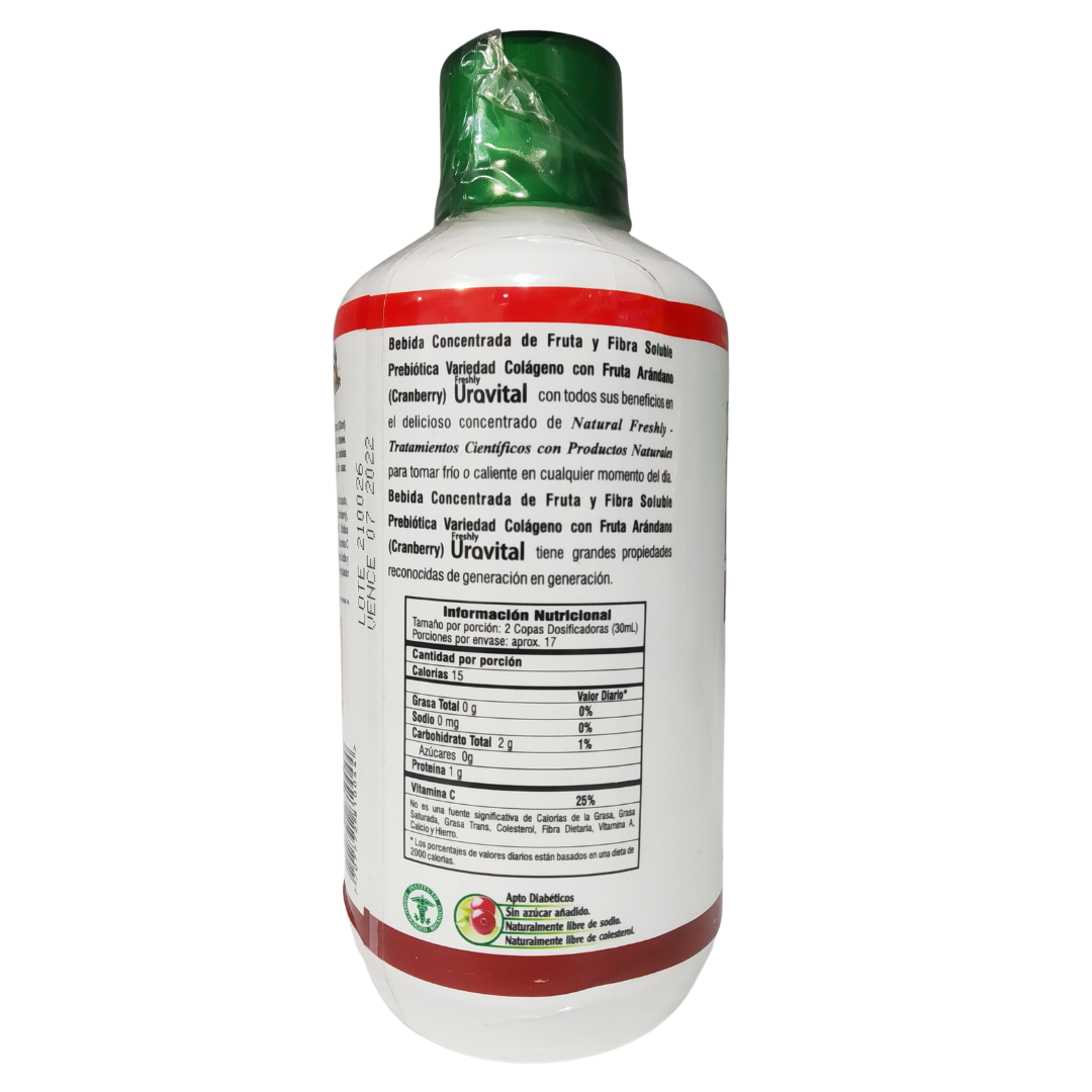 Urovital Bebida Concentrada - Natural Freshly - Botella 500 ml Bebida concentrada de fruta y fibra soluble prebiótica variedad colágeno con fruta de arándano. El arándano rojo, también conocido por su nombre en inglés Cranberry, es una fruta que posee varias propiedades medicinales y es utilizada, principalmente, para prevenir infecciones urinarias recurrentes, pues logra impedir el desarrollo de bacterias en el tracto urinario.