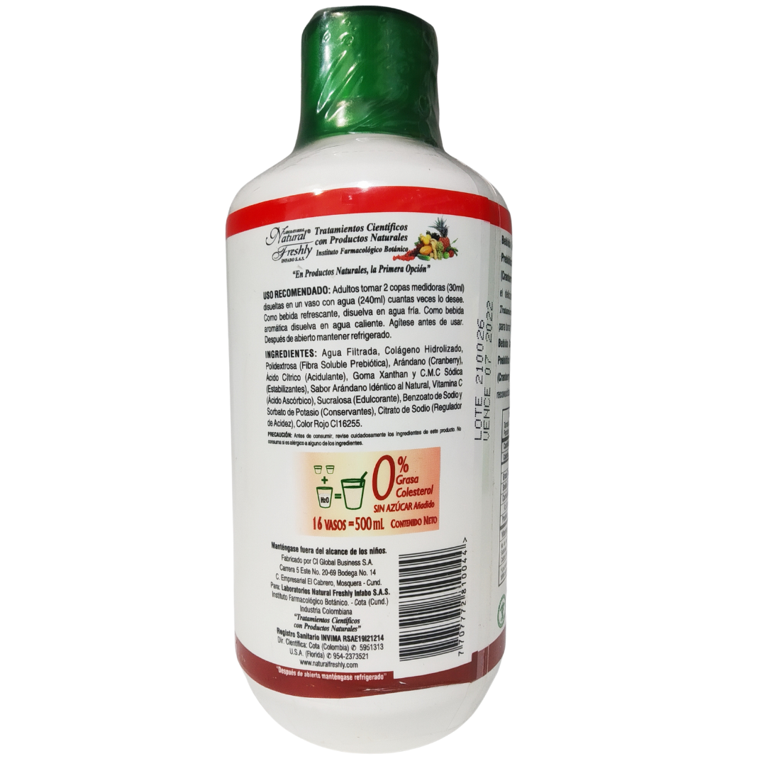 Componentes Agua filtrada, Colágeno hidrolizado, Polidextrosa, Arándano, Ácido cítrico, Goma Xanthan y C.M.C Sódica, Vitamina C, Sucralosa, Benzoato de sodio y Sorbato de potasio, Citrato de sodio. Sin azúcar añadido.