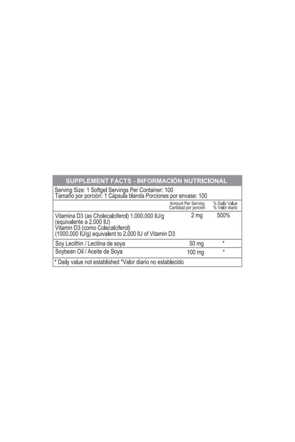 Componentes Vitamina D3 (vitamina) Lecitina de soya (vegetal), Aceite de soya (vegetal).