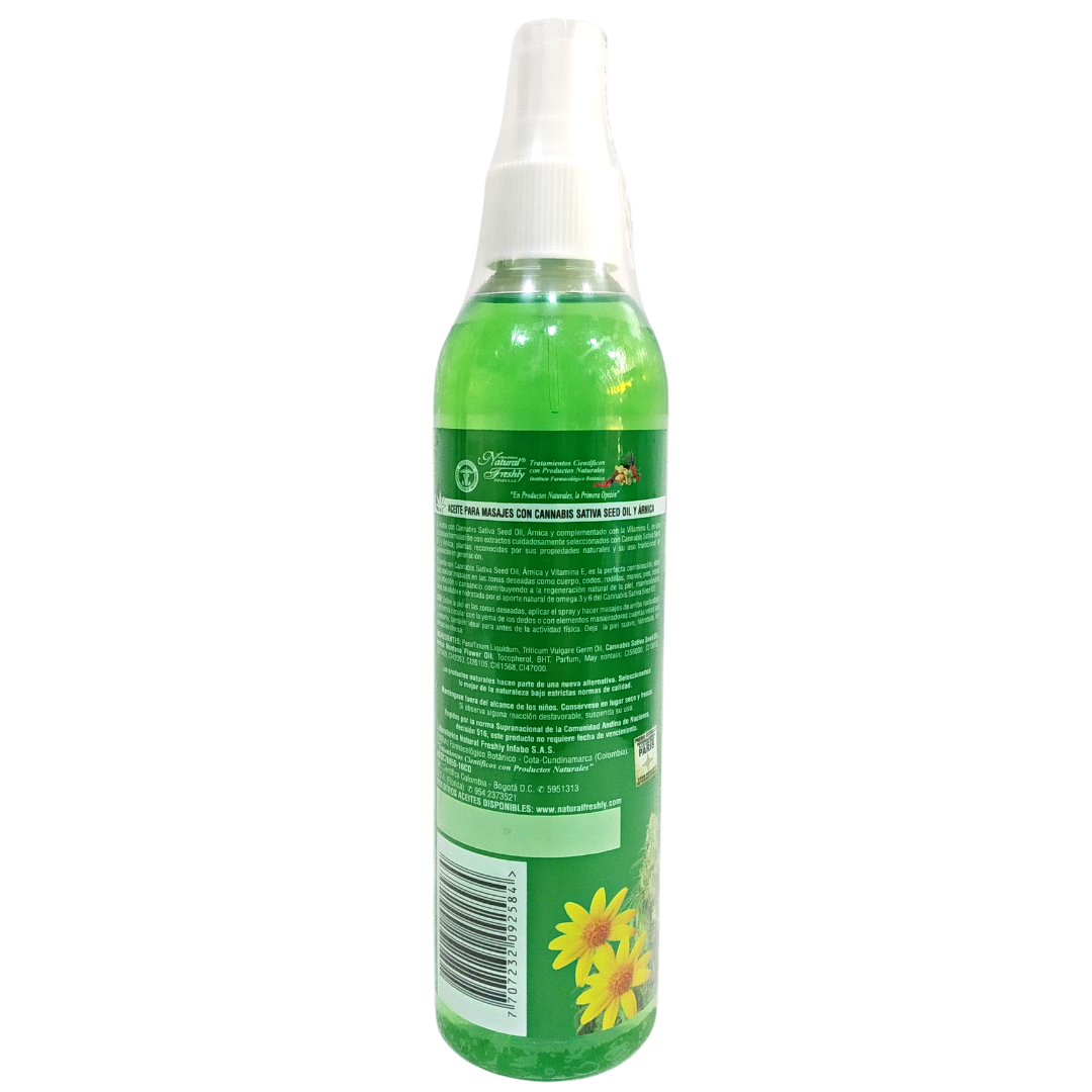 Aceite Biopronnabis - Natural Freshly - Frasco 240 ml Aceite para masajes con Cannabis Sativa Seed Oil, Árnica y Vitamina E, es la perfecta combinación, ideal para realizar masajes en las zonas deseadas como cuerpo, codos, rodillas, manos, pies, zonas con aflicción o cansancio contribuyendo a la regeneración natural de la piel, manteniéndola sana, saludable e hidrata por el aporte natural de Omega 3 y 6 del Cannabis Sativa Seed Oil.