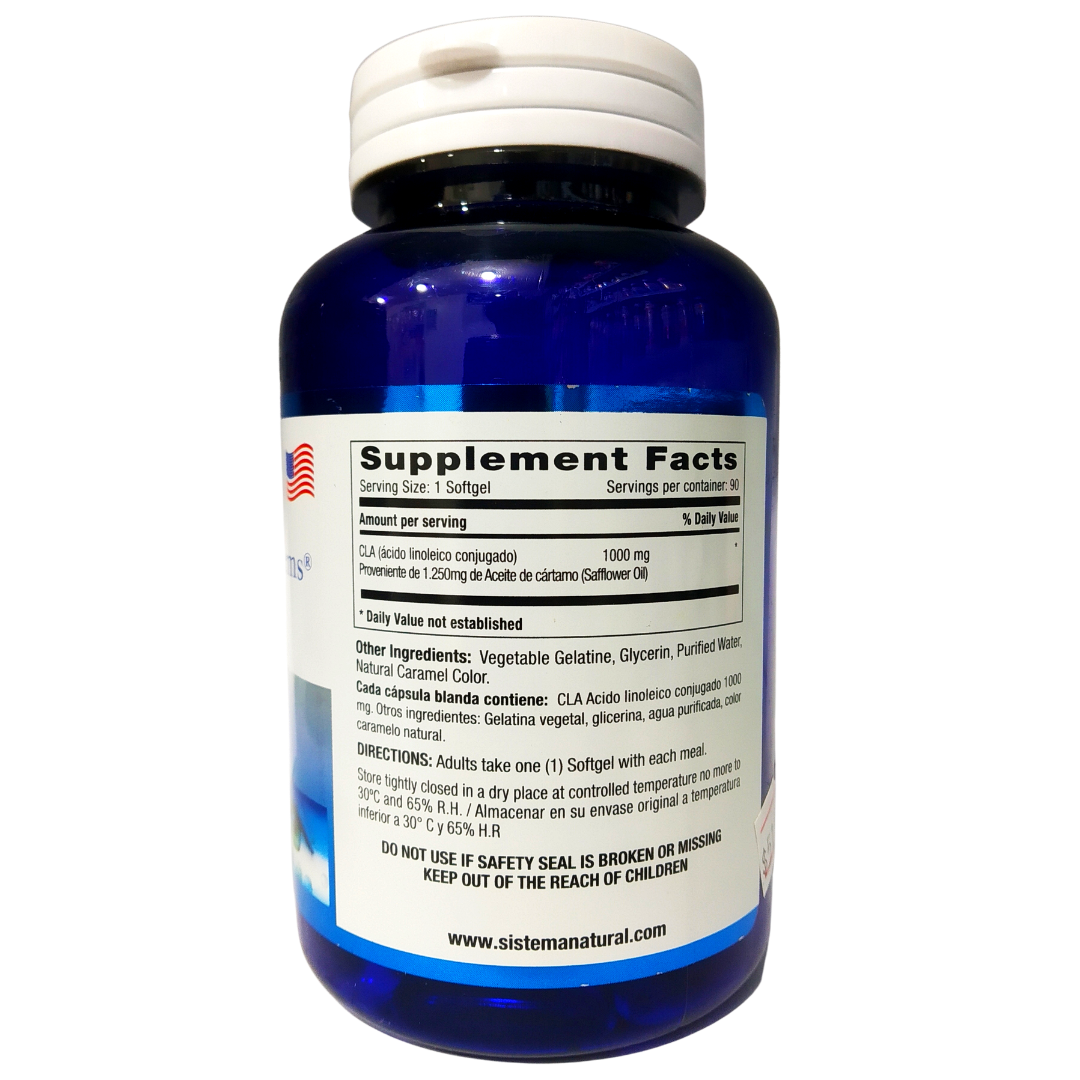 CLA 1000 mg - Natural Systems - Frasco x 90 Cápsulas Blandas Este suplemento, inhibe la acción de la enzima que transporta grasa desde el torrente sanguíneo hacia las células adiposas, impidiendo en consecuencia que estas se asienten y se acumulen