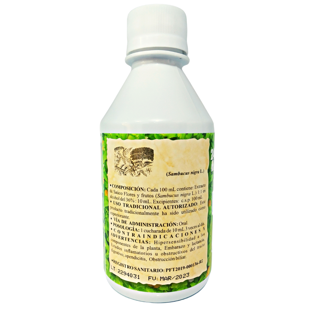 Componentes Cada 100 ml contiene: Extracto de Saúco Flores y frutos 1:1 en alcohol del 36%: 10 ml. Excipientes: c.s.p. 100 ml.